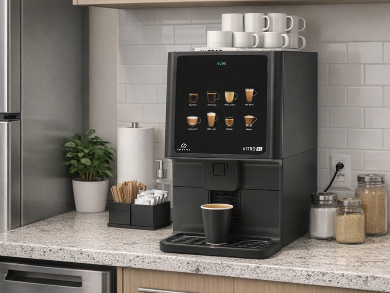 The Vitro S1 Evo is a compact and stylish commercial coffee machine designed for smaller workplaces that require high-quality coffee in a limited space. With its sleek modern design and intuitive touch selection, this commercial coffee machine is a great way to introduce better hot drinks at work. Ideal for offices and small hospitality environments, the Vitro S1 Evo offers a smart and efficient solution.